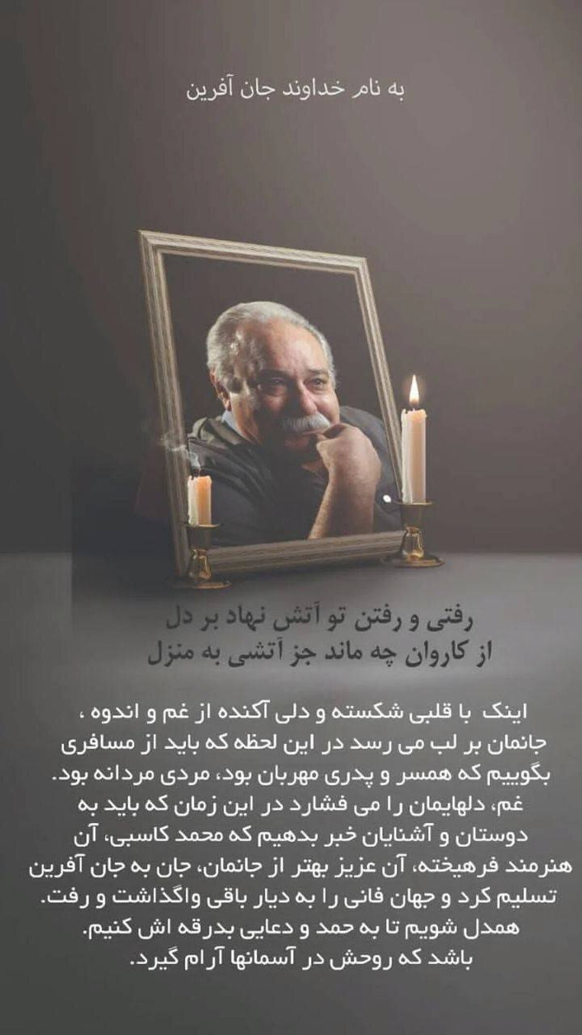 غم، دلهایمان را میفشارد در این زمان که باید به دوستان و آشنایان خبر بدهیم که محمد کاسبی، آن هنرمند فرهیخته، آن عزیز بهتر از جانمان، جان به جان آفرین تسلیم کرد وجهان فانی را به دیارباقی واگذاشت ورفت.