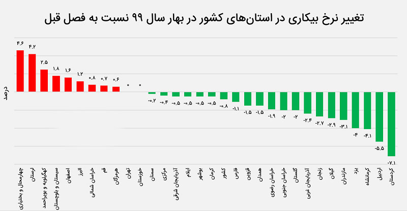 در بین استانهای کشور، چهارمحال و بختیاری، لرستان و کهگیلویه و بویراحمد در بهار امسال که کشور درگیر ویروس کرونا بوده با افزایش نرخ بیکاری مواجه شده است.